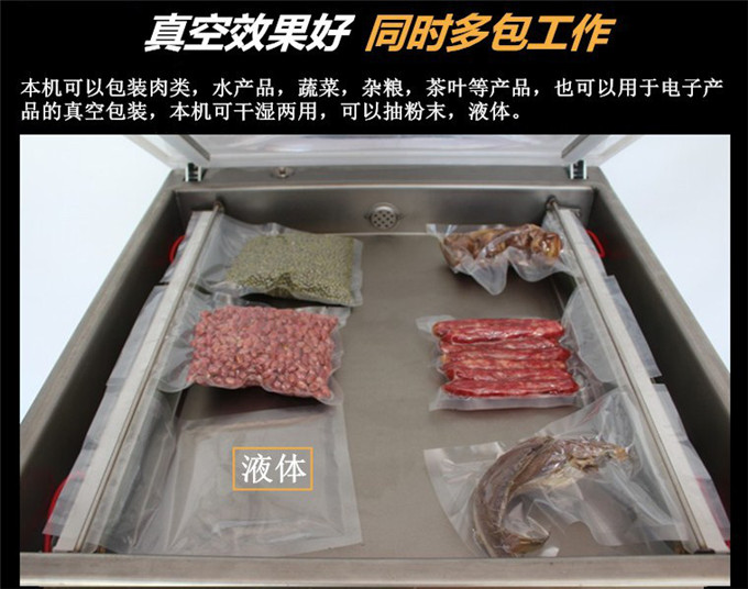 2:本機(jī)蓋采用全透明有機(jī)玻璃,對包裝過程一目了然。本機(jī)具有抽真空、封口一次完成功能,對不同的包裝材料和包裝要求,該機(jī)設(shè)有真空時(shí)間、熱封時(shí)間等調(diào)整裝置,以達(dá)到理想包裝效果, 本機(jī)可根據(jù)用戶的要求,配備換字方便、印字清晰的印字裝置,即在封口的同時(shí),在封口線上印上保質(zhì)期、出廠日期或出廠編號,以符合國家食品標(biāo)簽法的規(guī)定;